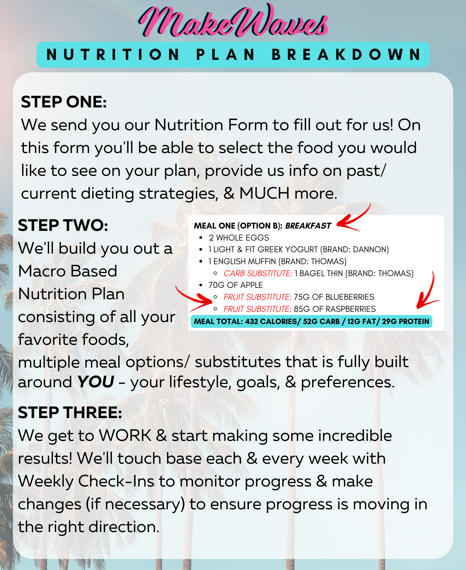 - Custom Nutrition Plan/ Macro Plan depending on preference